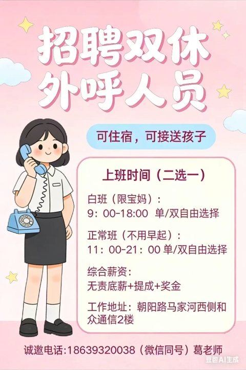 【招聘】双休外呼人员,可住宿,可接送孩子。上班时间:二选一白 班(限宝...