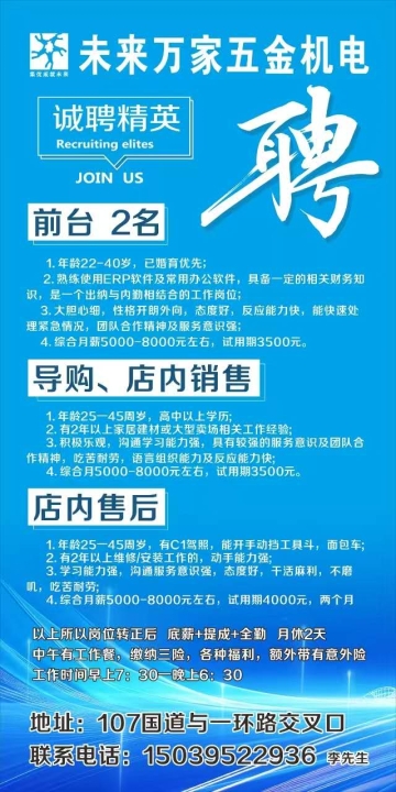 招聘:未来万家五金机电诚聘精英前台2名1。年龄22-40岁,已婚育优先;2。熟...