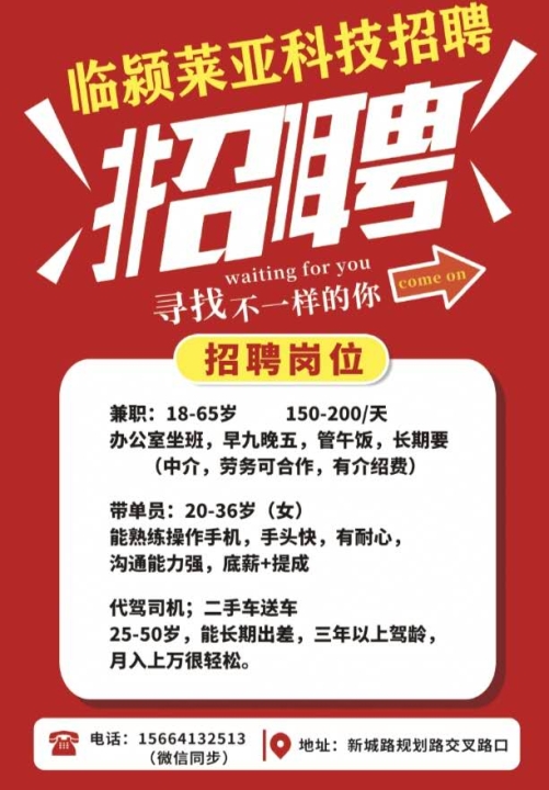 临颍莱亚科技招聘蒹职:18-65岁 150-200/天 办公室坐班,早九晚五,管午饭...