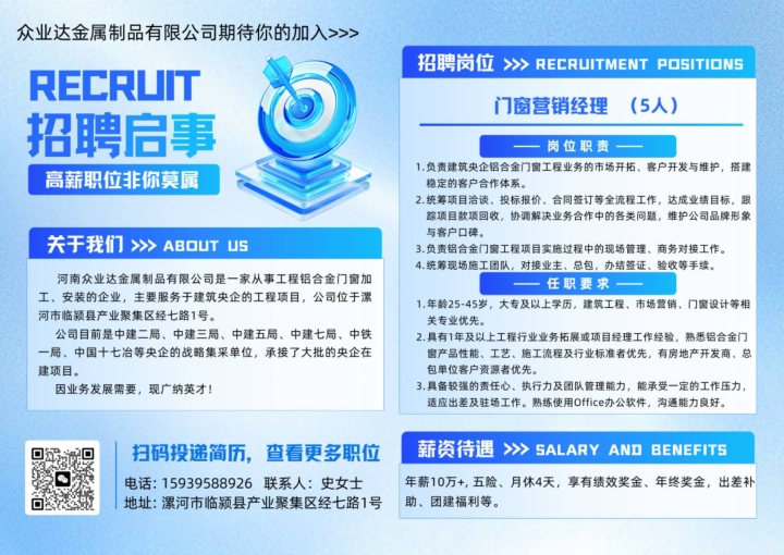 河南众业达金属制品有限公司 急招!!!业务经理1.年龄25-45岁,大专及以...