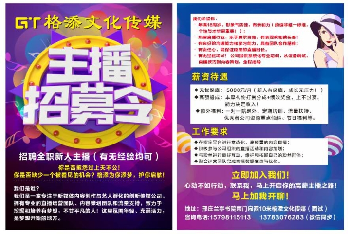 【格添文化传媒】招聘岗位:全职新人主播(有无经验均可)薪资待遇: 无忧...