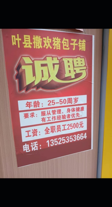 叶县撒欢猪包子铺连锁店诚聘:售卖员年龄:30-45周岁(女士优先)要求:服从...