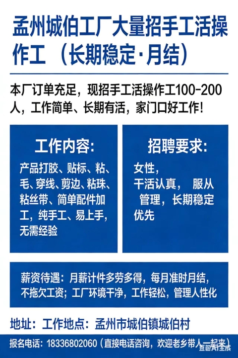 孟州城伯工厂大量招手工活操作工...